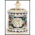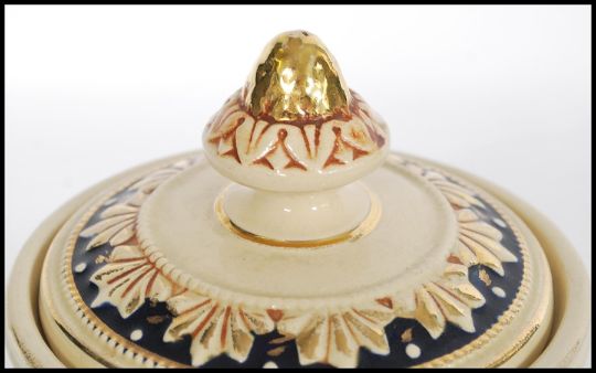 A vintage 20th century German stoneware tobacco jar humidor pot having relief scenes of lions and lionesses hunting an ibex. Cobalt ground with leaf and gilt borders. Impressed makers mark to base MR. Measures 18cms high x 13cm-diameter.