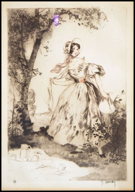 A 19th Century hand coloured etching on paper depicting a lady in a georgian style dress walking below a tree signed in pencil by artist J. Handy published by Gallerie Lutetia Paris. Framed and glazed. Measure:  33cm high x 24cm wide.