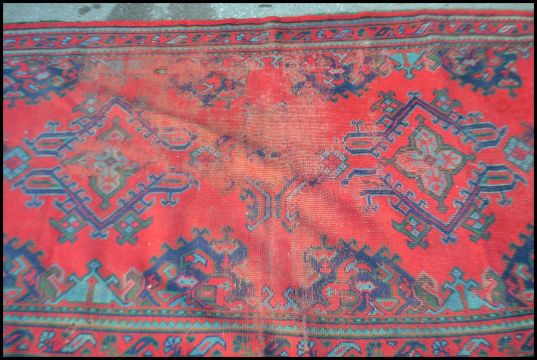 A 19th Century Baluch hand woven floor rug, Timuri, last quarter 19th century, on red ground with bold multi coloured isometric design, medium fringe. Measure:  260cm x 136cm
