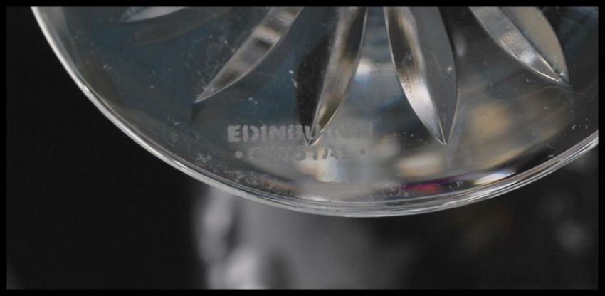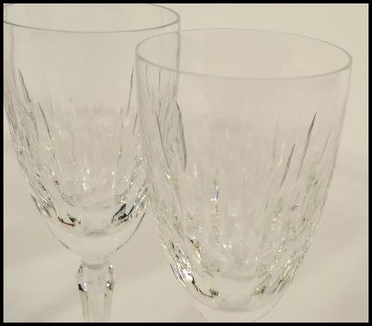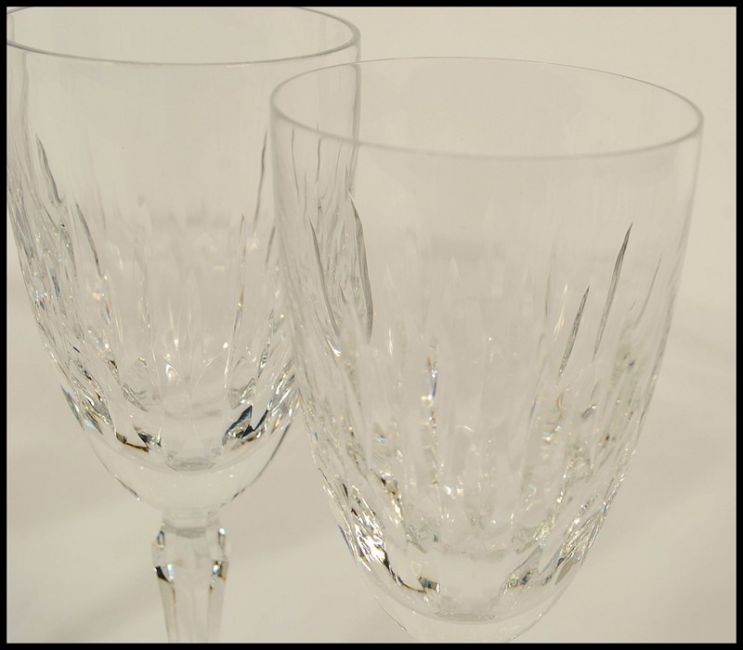 A set of 6 Edinburgh crystal cut glass wine glass having single stems with circular bases and facet cut bowls. 19cm high.