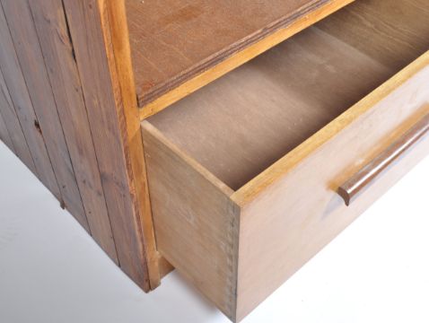 A stunning early to mid 20th century haberdashery multi drawers shop display wall unit in teak with oak panelling. The cabinet having 28 x glass fronted teak drawers above an open faced shelf with two large deep drawers to bottom. Th unit raised on plinth base. Measures; 200cm x 139cm x 54cm.
