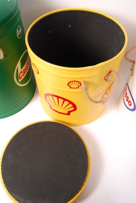Castrol - Esso - Shell - A collection of three nesting stool in the form of oil barrels, each having a metal barrel shaped body with vinyl covering , rope handles and padded vinyl seats. Each one having different petrol company brand design to them and sit within one another.
