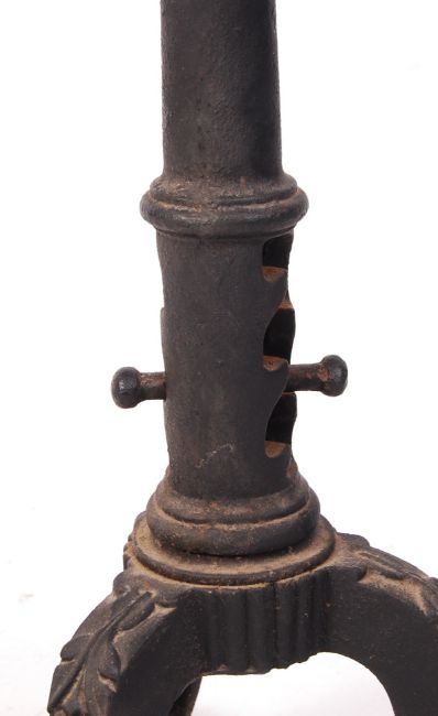 A 20th century antique vintage adjustable cast iron and wood stool. The stool having a cast iron tripod base with unusual height adjusting action with a varnished round wooden seat.