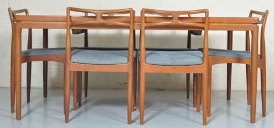 Johannes Anderson - Christian Linneberg - Model 94 - A 1960's retro vintage teak wood extending table and set of six ' model 94 ' dining chairs with the ' bow tie ' design back raised on tapering legs with pad seats. The table having draw extensions to the sides and two leafs fitting to them. Applied label to the underside of the leaf. Measures; 70cm x 90cm x 150cm - 242cm (with leaves).