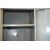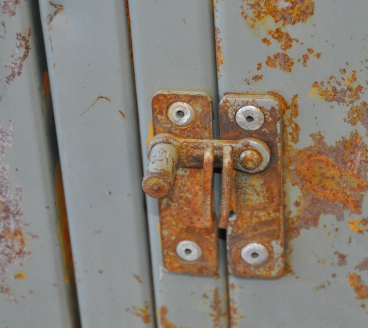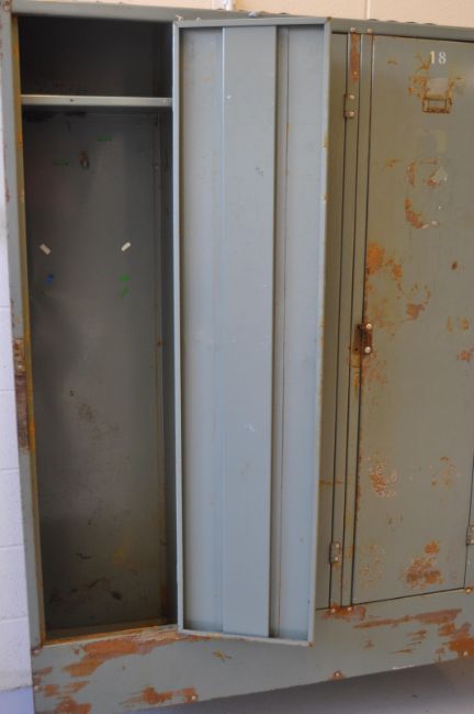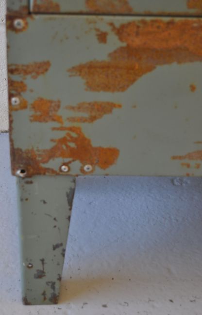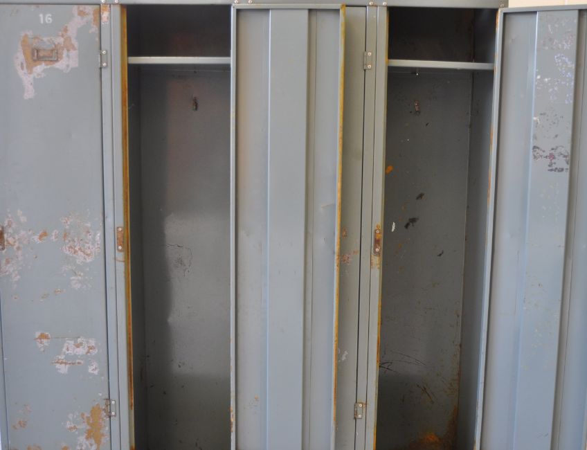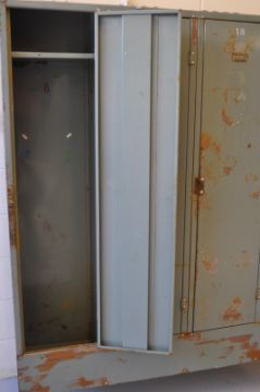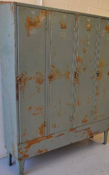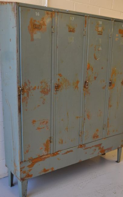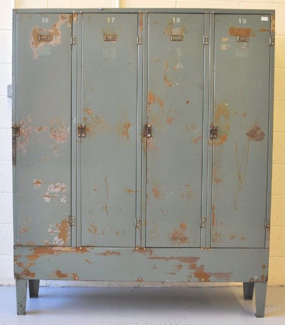 A vintage industrial four door metal locker each door having vents to top and revealing a shelved interior, the top of the locker being angled and all raised on tapered legs.