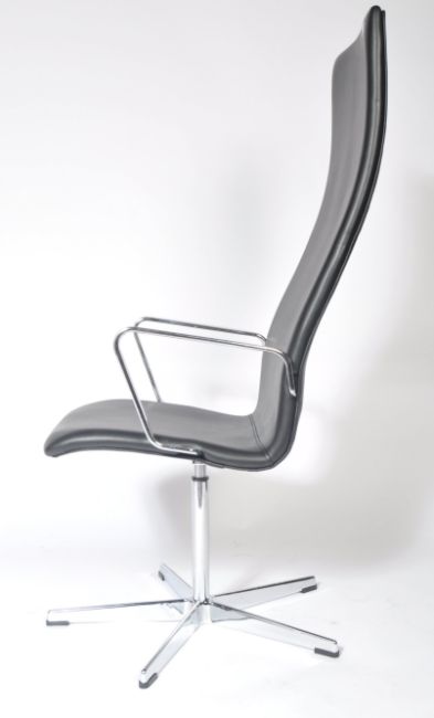 After Arne Jacobsen - Oxford Chair - A contemporary swivel high back desk chair having curved form upholstered in black aniline leather with polished steel armrest raised upon a steel five point star base.