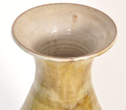 A large 20th century retro drip salt glaze vase having bands of colour with a central band having palm tree decoration. The vase shape having the classic wide tapering body and flared rim to top. Measures;  92cm tall.
