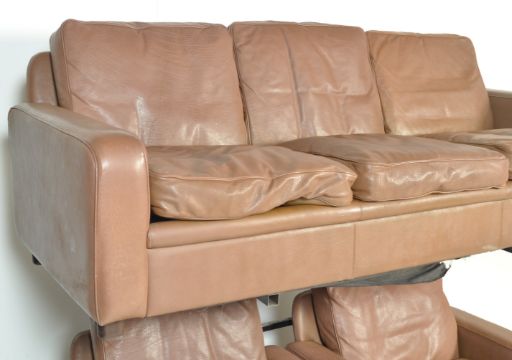Georg Thams - Thams Kvalitet - Vejen polstermobelfabrik - A 1970's Danish cognac red leather sofa suite comprising of a large two seat sofa settee and two matching armchairs. The suite upholstered in top grain leather having a simple form design with solid sides with rounded armrests all with button backed seat and backrest cushions. Applied label to seat.