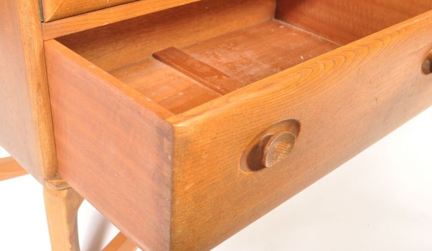 Lucian Ercolani - Windsor pattern - A rare 1970's retro vintage beech and elm sideboard credenza having a twin door storage cupboard flanked on one side by a single door cupboard above two short drawers raised on unusual bentwood ' X ' framed legs. Measures; 93cm x 129cm x 44cm.