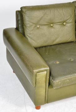 A 20th century Danish retro vintage moss green leather three seat sofa settee with three cushions to seat and backrest , all raised on teak stub legs.