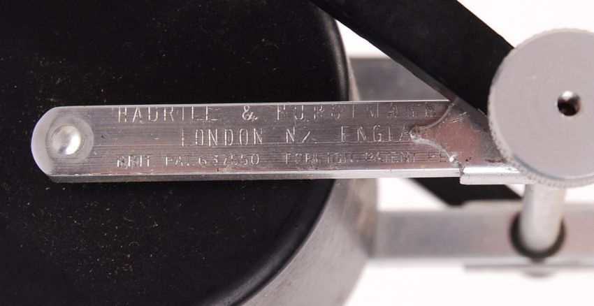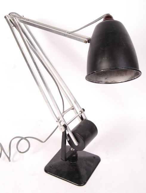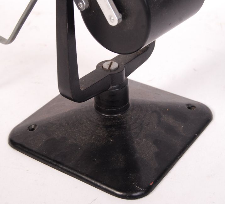 Hardrill & Horstmann - ' Roller Lamp ' - An early 20th century retro vintage British made work  / engineers desk / table angle poise barrel lamp. The lamp having the unique counter balance engineering that pivots within a cast metal cradle with holes to base for fixing to a surface. The shade being of little conical shape and much like a bucket being held by an adjustable arm. Markings for the maker to lower arm. Measures; 60cm in picture.