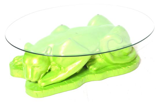 A 1960's retro vintage sculpture fibreglass panther coffee / centre table. The table comprising of a recumbent panther with jungle leaves painted in a Lamborghini murcielago green and having an oval glass top.