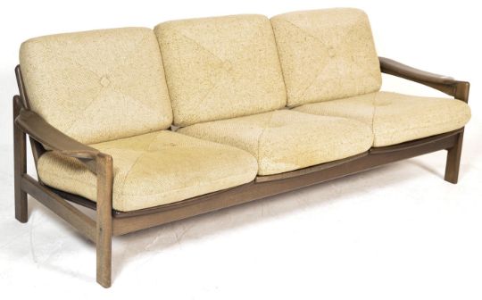 A fantastic 1960's retro vintage stained beech three seat sofa settee , the frame a solid beech wood and having propeller armrests with oatmeal coloured woollen seat cushions and backrest cushions. Bearing similarities to that of Arne Wahl Iversen. Measures; 68cm x 195cm x 80cm seat height 37cm.