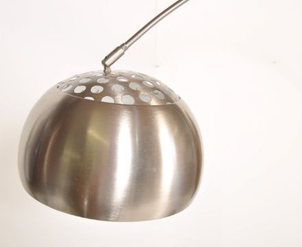 After Achille Castiglioni - Arco Lamp - A contemporary floor stand standard lamp. The lamp having a large sweeping chromed neck with a chromed metal rounded shade all being weighted down by a round piece of black marble.