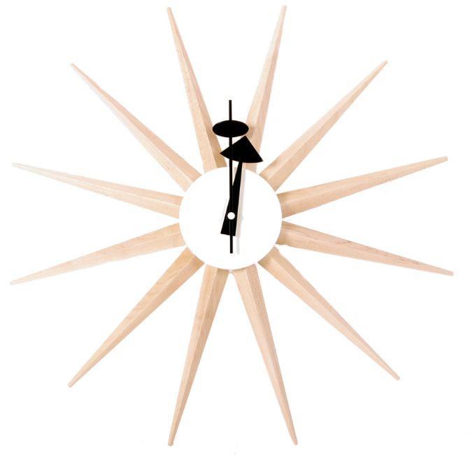 After George Nelson - Starburst Clock - A contemporary wall clock. The clock comprising of triangular tapering solid maple wood surrounding a white coated metal centrepiece with shaped ebonised hands. Measures 48 cm x 48 cm (in box).