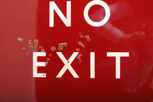 A rare original vintage British Railways ' BR ' ' No Exit ' porcelain enamel station sign. Maroon and white, in typical BR form. White text on red ground. Measures approx; 46cm x 61cm. Rare.