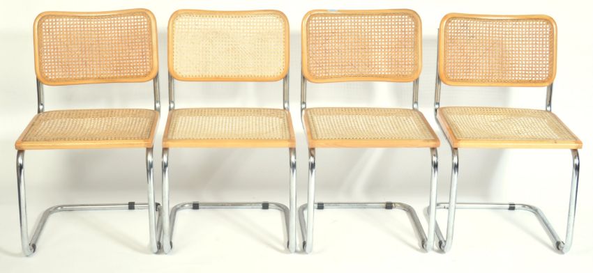 After Marcel Breuer - B32 - Cesca - A set of four retro vintage 20th century Italian cantilever dining chairs of chrome tubular construction with beech framed bergere seats and back rests. Measures: 76cm x 64cm x 64cm.
