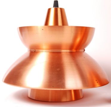 A pair of near matching 1970's Danish inspired copper dished pendant ceiling lights comprising of two dished sections facing opposite ways with a split conical shape through the centre housing the light fitting. Measures; 24cm tall.