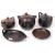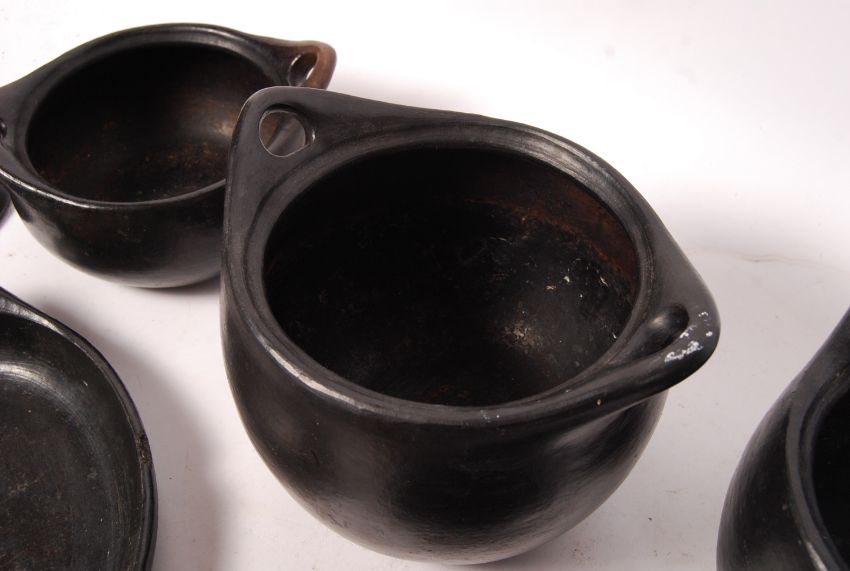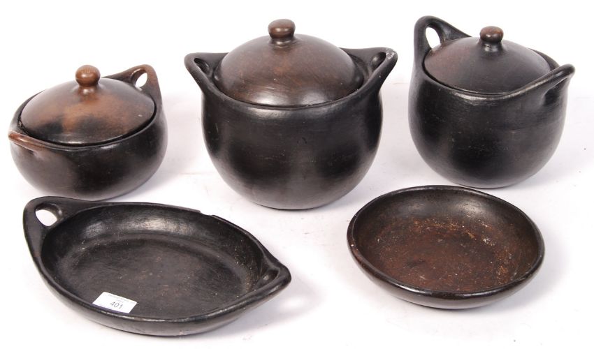 Barro negro pottery - A mid 20th century Mexican Oaxaca retro vintage black stoneware pottery to include three graduating lidded food storage containers with handles to sides and to plates / bowls with handles. Tallest measures;