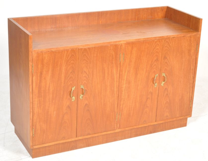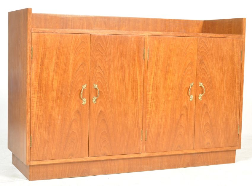 A late 20th century retro vintage teak wood sideboard record hi-fi cabinet comprising of a gallery backed top with two twin door cupboards revealing record storage interiors, each handle being ornate gilt leaf decorated. The unit raised on a plinth base.