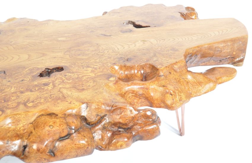 An unusual contemporary bespoke burr wood live edge tree wood slab coffee / centre table. The varnished coffee table having a wonderful grain and raised on three short copper hairpin legs. Measures; 104cm x 69cm x 42cm.