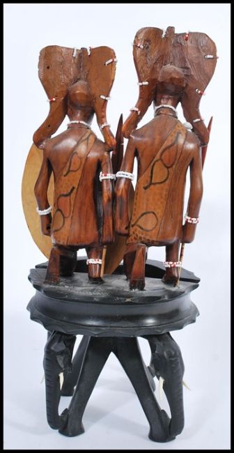 A vintage early 20th century African ebony ashtray raised on a carved elephant base with African tribal figure tops. 46cm high.