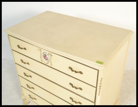 A Louis 16th style painted shabby chic bachelors chest of drawers having a bow front and raised on cabriole legs. The drawers with gilt metal ormulu handles. Measures: 85cm high x 79cm wide x 49cm deep.