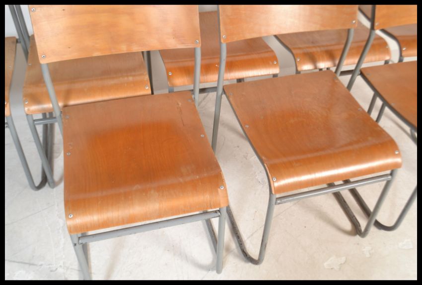 A set of eight vintage retro 20th Century ply stacking school chairs raised on tubular supports.