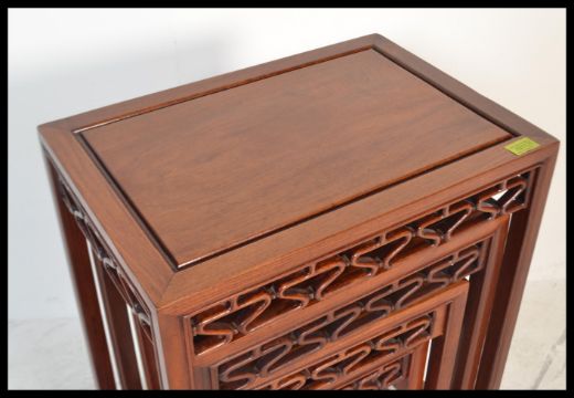 A 20th century Oriental Chinese hardwood quartetto nest of four graduating tables.The rectangular tops above carved freize sections, raised on squared legs united by stretchers. Measures: 66cm high x 51cm wide x 36cm deep.