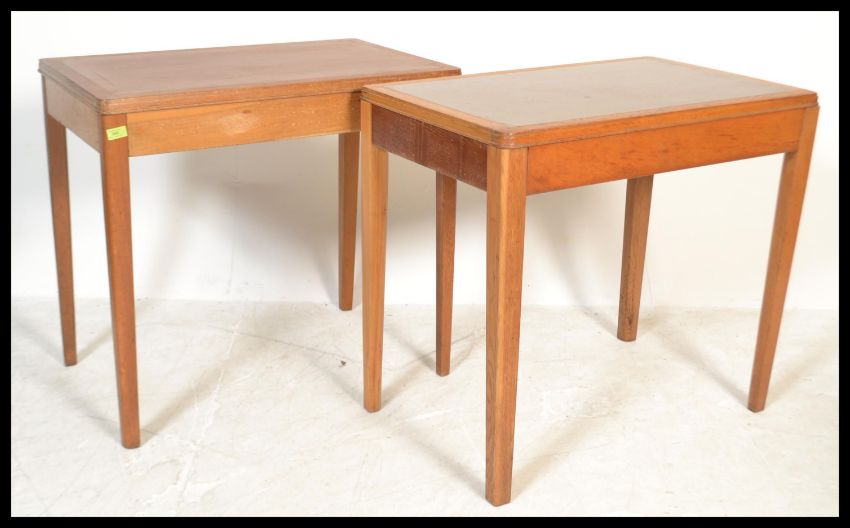 A pair of mid century Air Ministry marked office desks - writing tables in golden oak being raised on tapering legs with inset work surface atop.