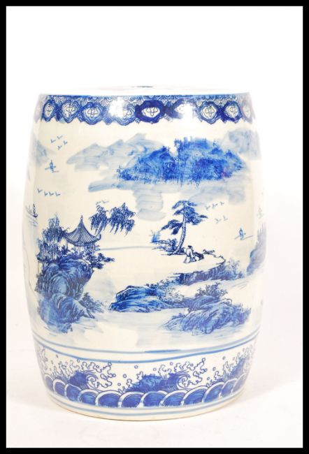 An early 20th century large Chinese ceramic stool of barrel shape having hand painted decoration depicting traditional scenes with buildings and fishermen. Calligraphy lettering character marks to side. Measures 35cm high 29cm wide.
