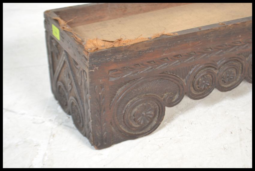 An 18th century carved West country oak long footstool. The carved oak planked rectangular base with carved concentric decoration, lacking upholstered top. Measures: 20cm high x 124cm wide x 24cm deep.