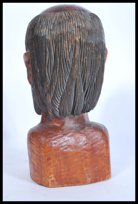 An unusual early 20th century carved wood bust of a gentleman with large moustache. Single carved piece of wood raised on socle plinth. Measures 40cm high.
