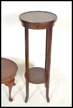 An Edwardian mahogany circular torchere plant stand raised on squared legs with circular top above together with a small mahogany side table
