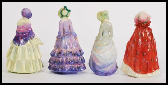 A group of four Royal Doulton figures to include HN1447 Marigold, HN1445 Biddy, HN1444 Pauline and HN1647 Granny's Shawl. Tallest 15cm high. Painted mark to bases potted by Doulton and Co.