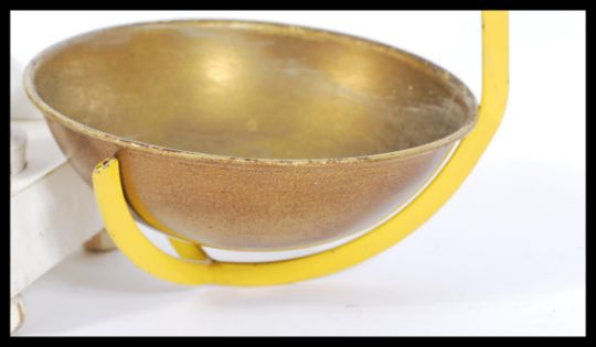 A pair of vintage retro 20th Century Taunton Vale white painted wood kitchen balance scales having a turned column to the centre with floral patterning to the arms and base, brass bowls and a selection of graduating weights including 2oz, 4oz, 8oz and 1lb.