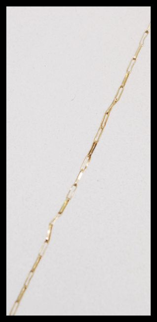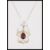 A hallmarked 9ct necklace and pendant. Fine box link chain with hoop clasp having a large red and white stone scrolled pendant. Weighs 3.7 grams. Pendant measures 3cm long chain measures 20cms long.