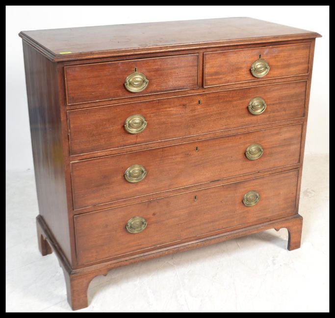 A 19th century mahogany chest of drawers being raised on bracket feet with 2 short over 3 deep drawers having brass handles. Measures: 103cm high x 113cm wide x 54cm deep.