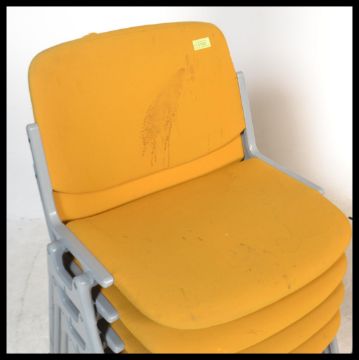 Giancarlo Piretti - Castelli - DSC Axis 106 - A retro vintage set of 12 Italian dining / office / dining / stacking chairs . The chairs having a mustard yellow fabric pad seat and suspended backrest supported by a polished steel brace with ash grey plastic coated tubular legs a floor levelling feet. Mould mark for Castelli to the underside. Measures 75 cm high and 53 cm wide.