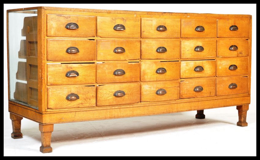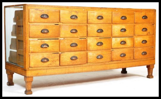 A good early 20th century Art Deco multi drawer vintage haberdashery shop display cabinet counter having fitted solid oak drawer fronts and handles, glass top and sides all being raised on stepped deco block feet. Measures : 92 cm high X 183 cm wide X 62 cm deep.