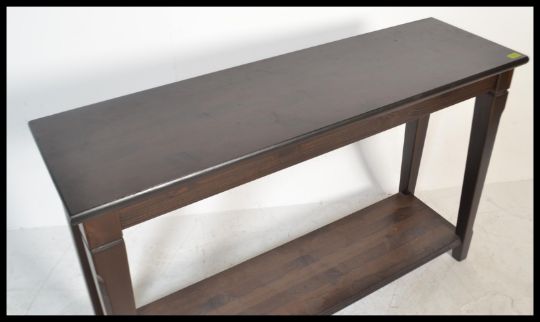 A 20th century contemporary oak console table of rectangular form having square tapering legs united by twin tiers. Measures: 75cm high x 120cm wide x 36cm deep.