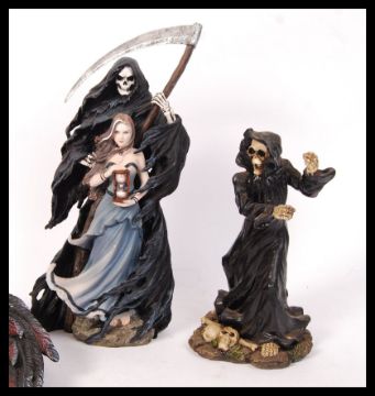 A collection of resin Grim Reaper figure to include; Nemesis Now figure , Nemesis Now wall plaque and another.