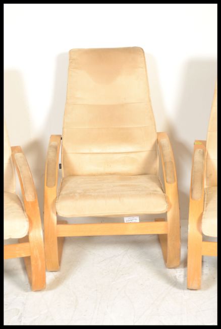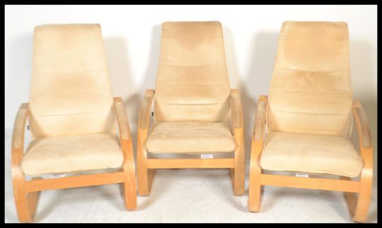 A set of three 20th century / contemporary Danish bentwood cantilever armchairs easy chairs in the manner of Westnofa Ingmar Relling having shaped ply supports with makers labels present with original upholstery.