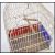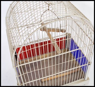 A vintage 20th Century bird cage having white bars and a wooden perch to the interior with blue and red glass panels. 40cm high 32cm wide.