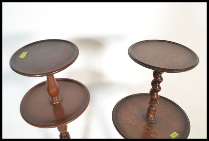 A Victorian mahogany barleytwist dumb waiter with twin circular tiers being raised on splayed feet together with another reproduction with 1 tier missing. Measures: 94cm high.