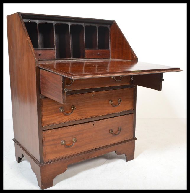 An Edwardian mahogany bureau being raised on bracket feet with a bank of drawers having appointed bureau atop