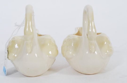 A pair of vintage 20th century Belleek ceramic creamer jugs in the form of swans. Green printed marks to base.