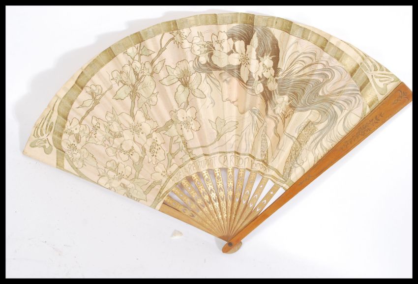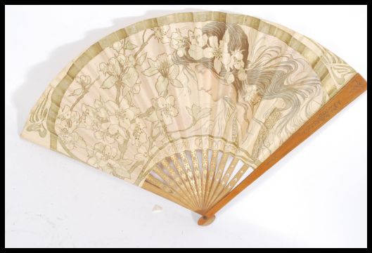 Two vintage early 20th century fine hand fans to include a French example with depicting a maiden with flowers retailed by Duvelleroy Paris along with a Chinese paper hand fan with floral bamboo decoration. Measures 27cm long.