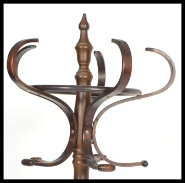 A vintage 20th century Thonet style bentwood hat stand being raised on splayed legs with s-shaped hooks atop. 183cm high