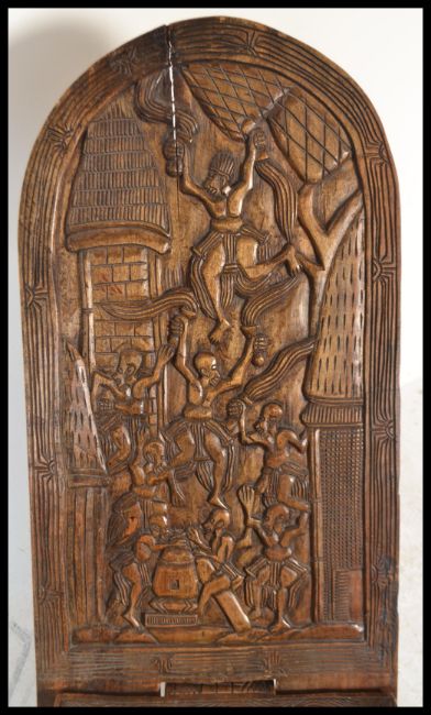 A 20th Century Camel stool modelled as a camel, fitted with a blue leather saddle together with a heavily carved African dug out /birthing chair.